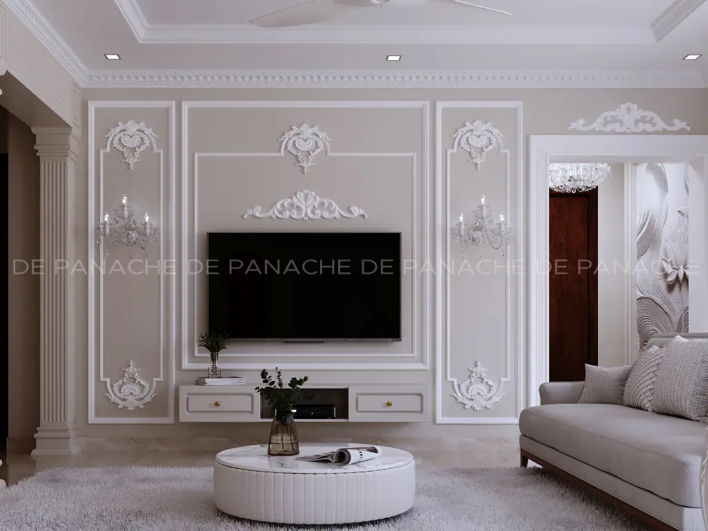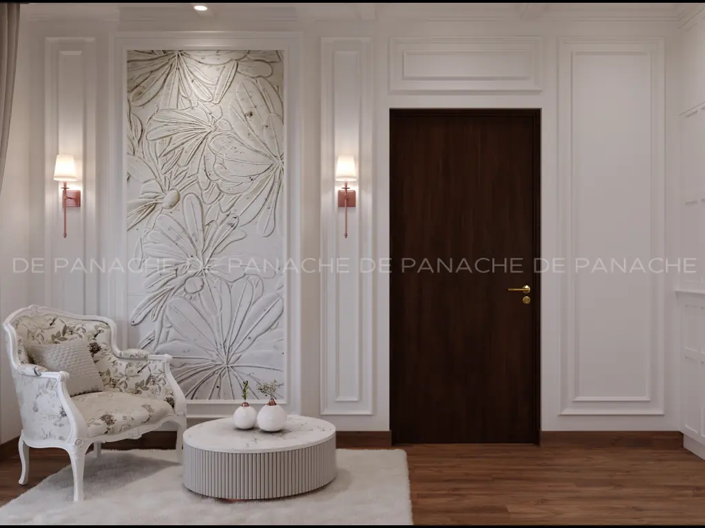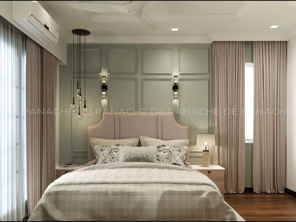 Coming to the sitting area we have tried to make it look bigger and so we have covered up the whole space in stark white combining it with a tinge of light green. The huge wall-mounted wardrobes also define the space quite well. Along with it, the king-size bed has been fixed with layers of headboard designs which has indirect lighting with it. The backdrop has been done smartly with vinyl-coated wall coverings in which each wall has a story to entail- the story of beauty and the story of elegance.