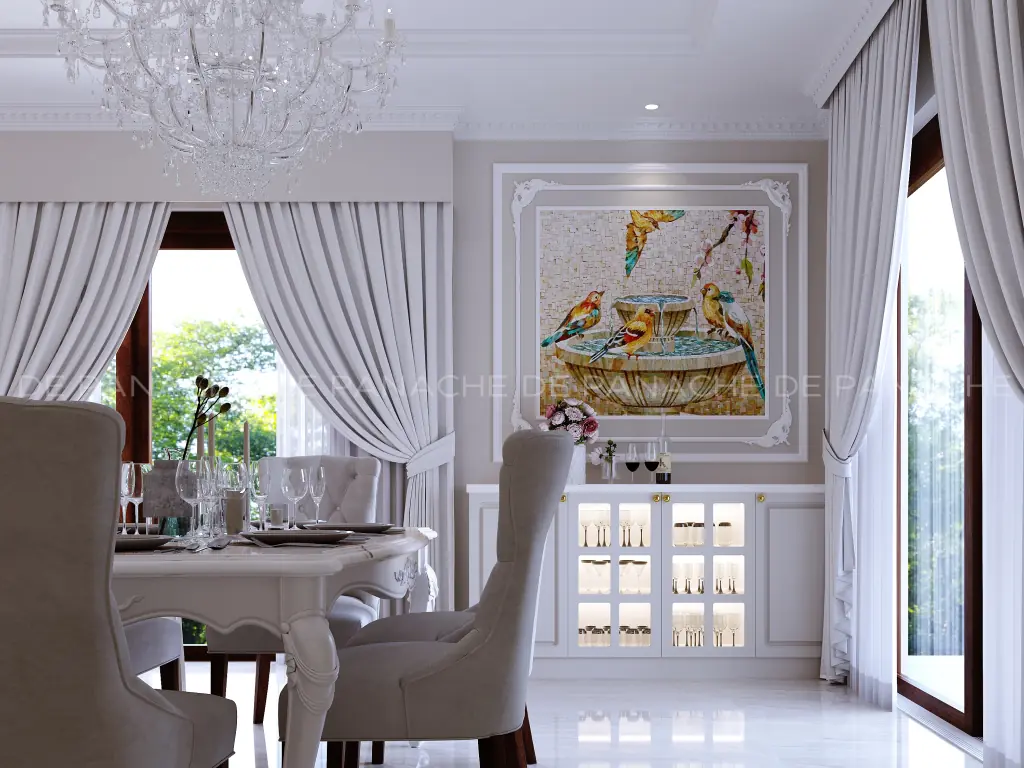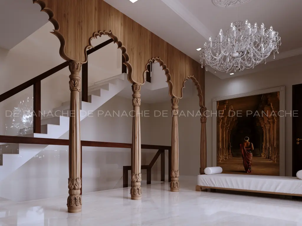The whole décor has been inspired by the dance of sunlight which gets light and dynamic energy to the interior space. The architrave with the niches defines the free-flowing space between the kitchen and the dining. We have an exciting beauty in the dining corner. Handmade sandstone depicting the falling of the autumn maple leaves has been shown there which is an exclusive material by interior design Bangalore. It is an ode to the autumn season which brings new hope in our life-giving us an entirely new season to look forward to. The beautiful chandelier which hangs above the four seated wooden dining table makes the place look more vibrant.