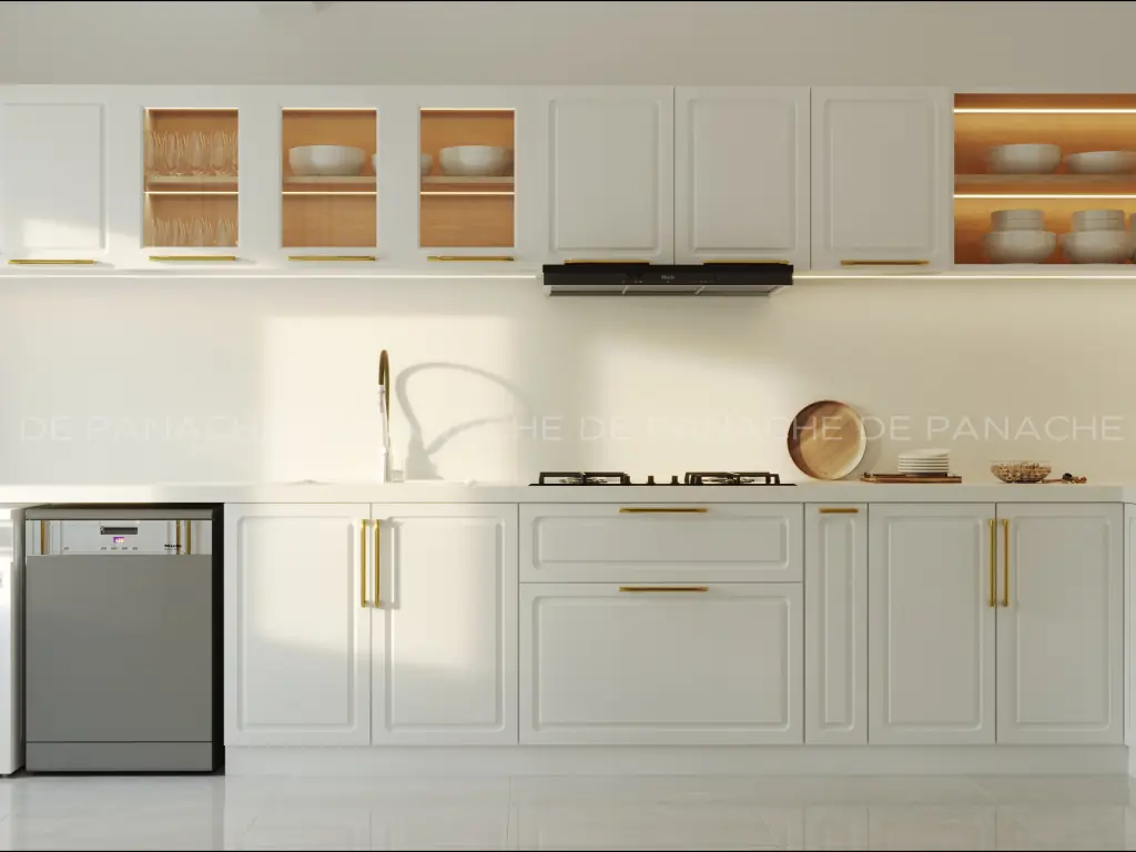 The long hanging lights from above gives it a chic look and gives it a wonderful and rich space experience. The other side of the whole space is bounded by nature in other words the extended portion of the space has been shaped into an open verandah with sliding glass doors which let you experience the natural light, wind, and smell. To be one with nature. The panel lights of the ceiling cooperating with the luxury crystal lights create a pleasing effect. The other side of the living room has been completed with a huge T.V. cabinet which solves manifold purposes. It lends its sides for the crockery to settle down in an exceptional manner and the extra storage capacities make it look huge and rich. The sections fitted with lights inside highlight the whole space and make the whole set up look magnificent.