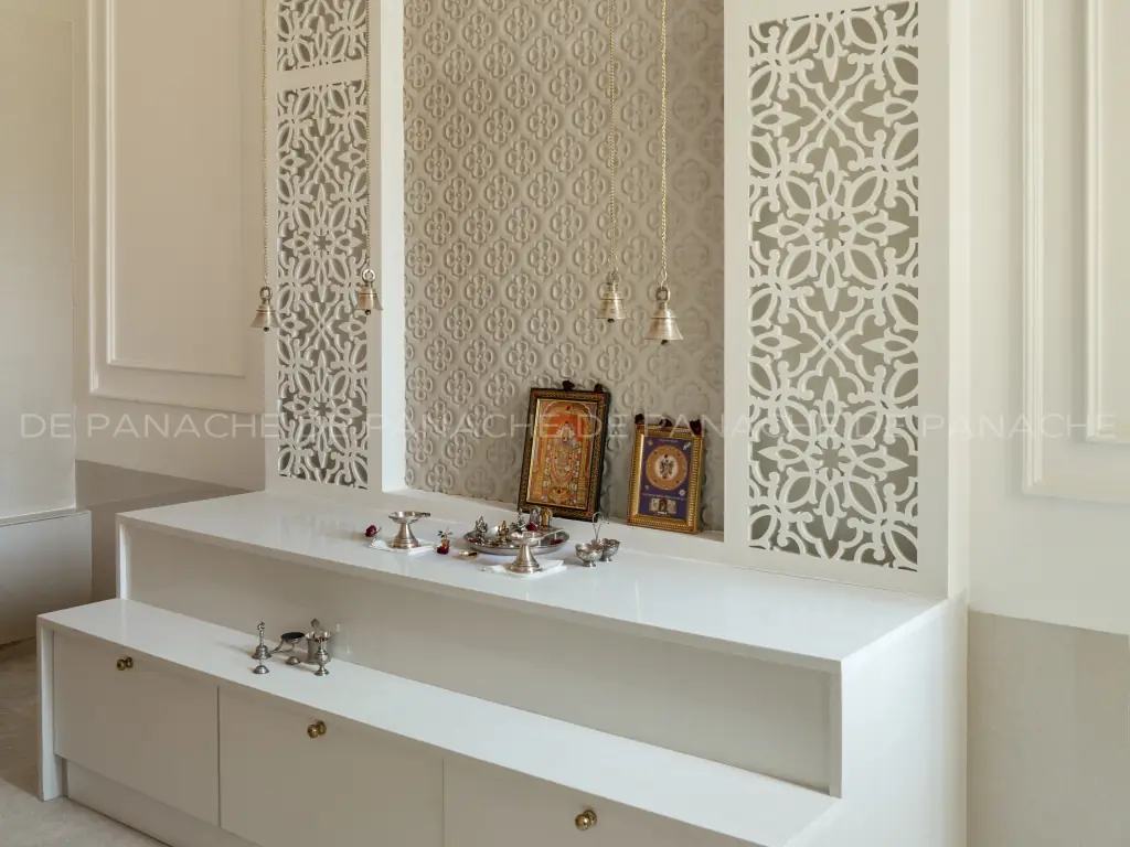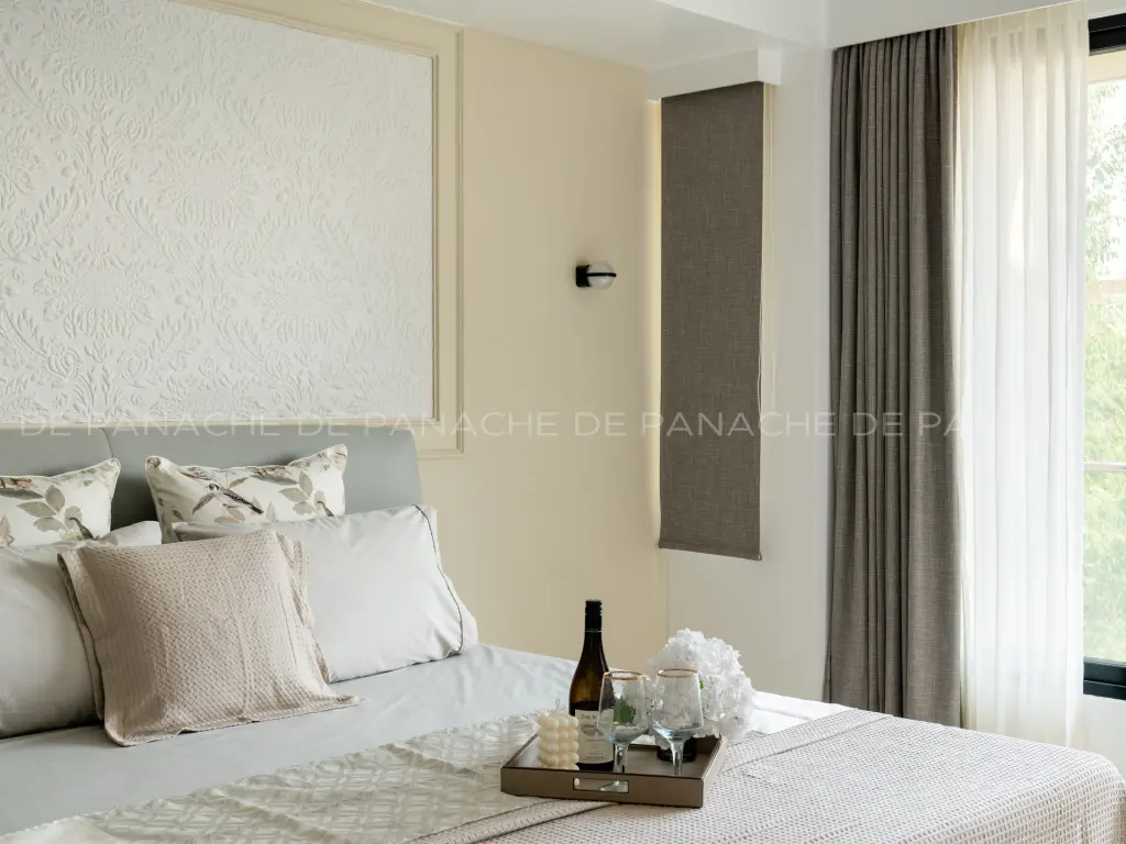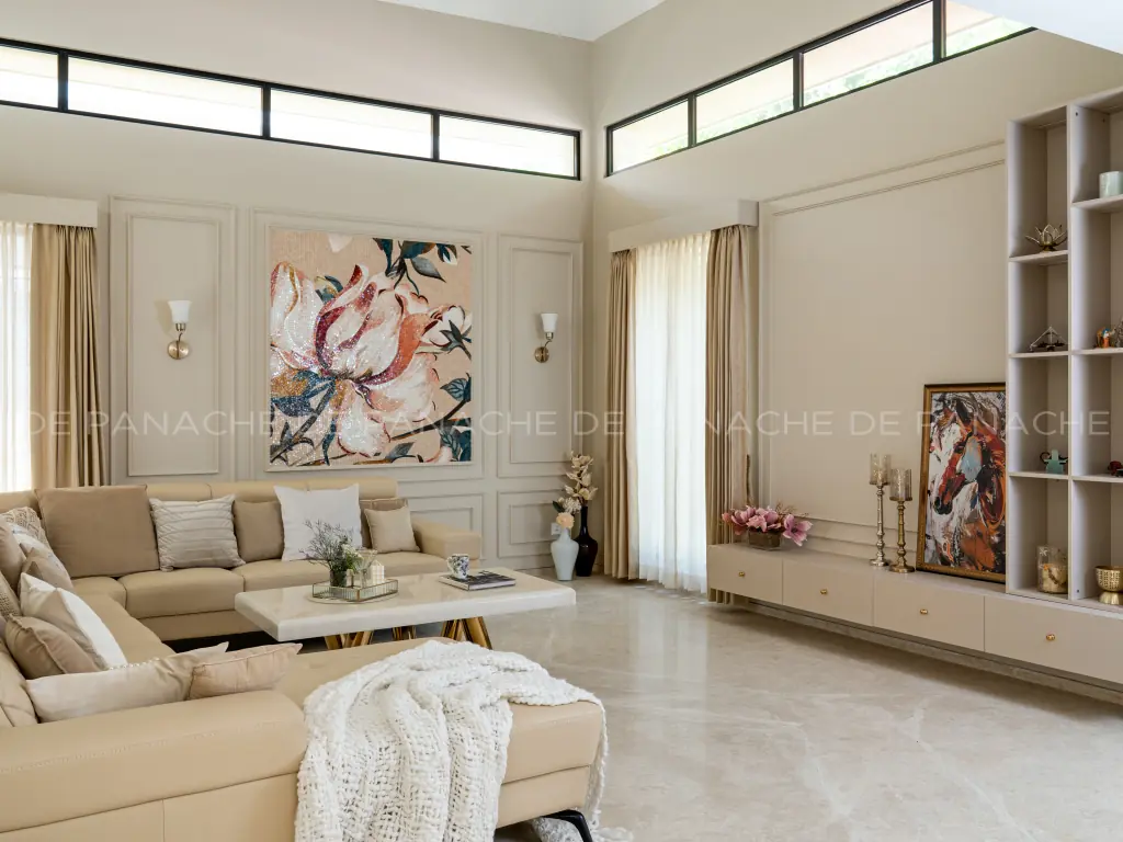 Interior designing is an art that takes into consideration not only the science it has in it but also carefully nurtures one’s ideas, taste, and interest. De Panache has always tried to deliver more than it could, thus always pushing the boundaries of excellence and creating beautiful study rooms. This Villa has been carved with love by the team where comfort and luxury were the two terms that would define each other. The bedroom has been presented in the most simple yet sophisticated solid colors, complementing it is the full-length beautiful curtains in ash and white. The backdrop of the master bedroom has been decked up in the exclusive collection of Handcut glass mosaics.