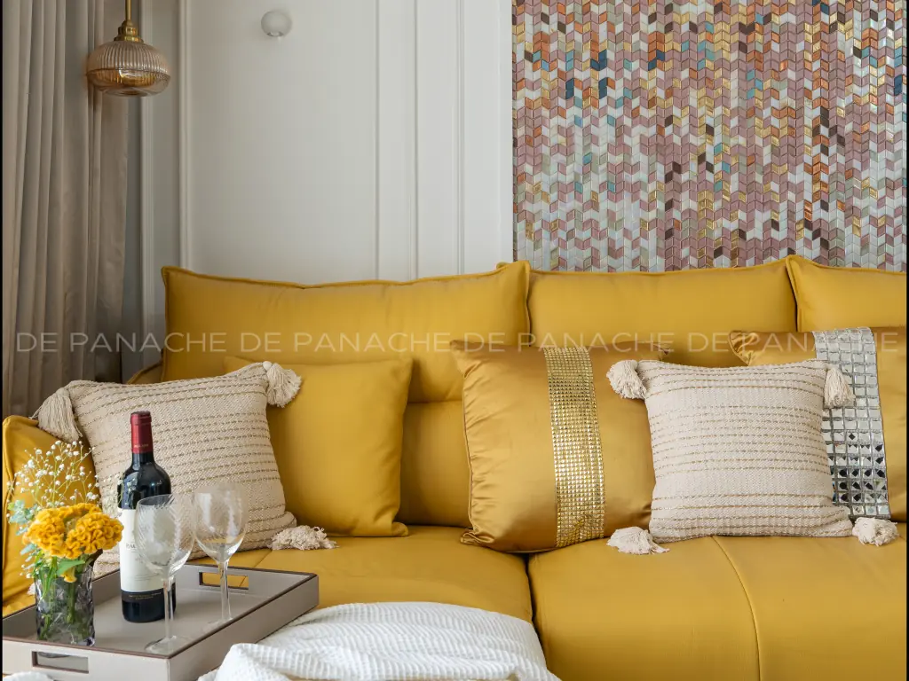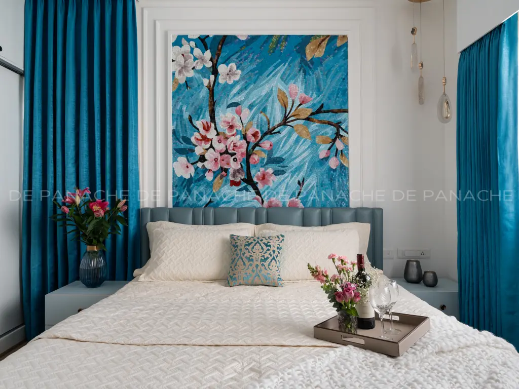 The backdrop of the queen size bed has been decked up with curved stonework giving it the wavy patterns symbolizing the journey of life with ups and downs. The huge crystal lamps on both sides of the bed play the perfect combination of light and shadow, which has become the theme of the interior of the house. To the entrance on the pathway to the room, there is a huge canvas of an abstract painting being placed in a candid way to make it special in an otherwise calm interior as that is the only piece with the splash of different bright colors. Complementing it is the wooden floor and the customized beige colored rug. The white queen size bed has been perfectly finished with an extra cushiony headboard to make it look out of the world. Thus, this interior in itself has a story to tell for the tired souls. So, De Panache creates the masterpieces where each house tells you the stories of you.