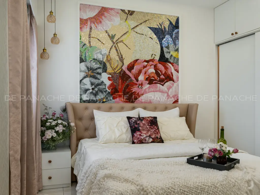 The master bedroom has been again finished in pristine white, which gives a soulful experience. The huge king size bed has got an extremely comfortable velvet cushioned headboard with the softest mattress; all have been customized according to the need and taste of the clients. The backdrop of the bed has been decked up in mother of pearl inlay again in white to complement the rest of the interior. The bedside cabinet and the crystal chandeliers give the whole interior a magnificent look.