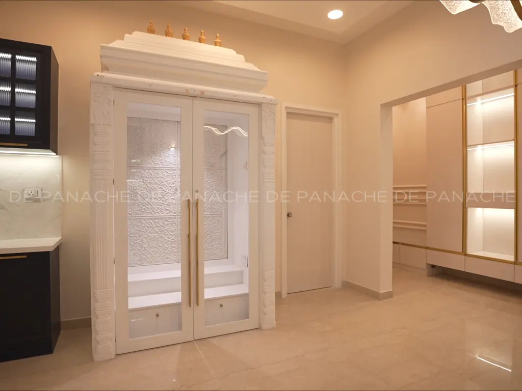 The full-length windows let the natural light breathe into the veins of the interior. The study unit, as well as the study storage all, have been kept simple but elegant. The wooden wardrobe again in white twining with the whole interior space, clearly reflects the royalty of the décor. The white marble flooring, as well as all other accessories, completely fit in with the entire décor. De Panache believes in a unique presentation. Thus the team keeps on striving excellence.